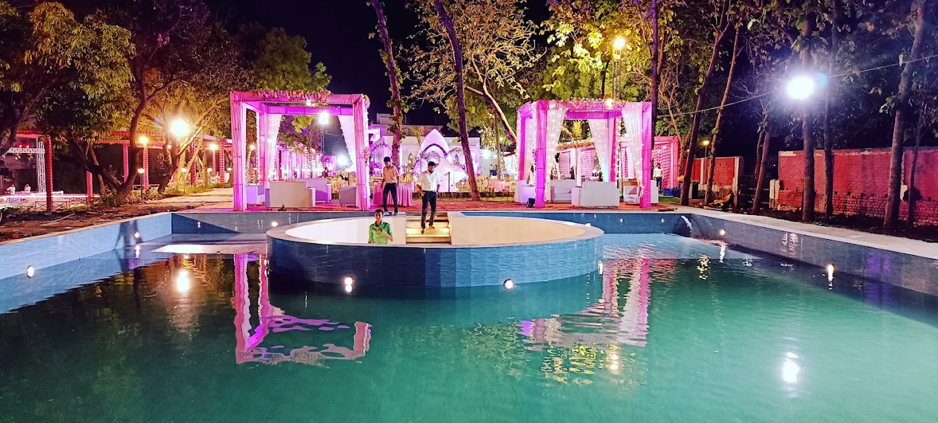 💦 Beautiful Swimming Pool Backdrop for pre-wedding functions and photography 🌊 Exclusive Stage on Water for a grand and unforgettable wedding ceremony 🚤 Royal Bridal Boat Entry for a magical and cinematic wedding moment ❄️ Luxury Fully AC Banquet Hall for elegant indoor wedding functions